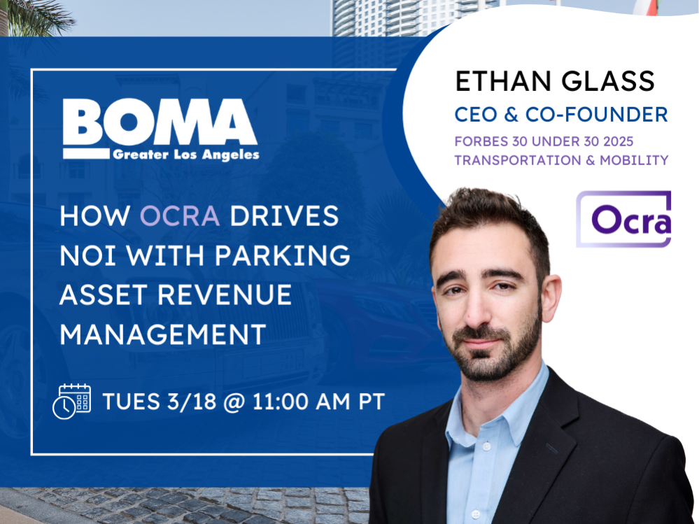 This month we will have a presentation from Ethan Glass, CEO and Co-Founder of Ocra. Our members will learn about how the Ocra platform streamlines parking operations to boost revenue and improve asset management.